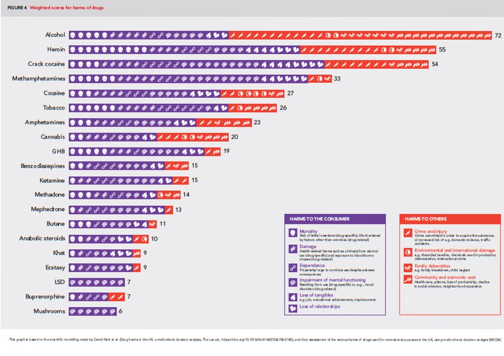 Die Global Commission on Drug Policy hat eine Infografik über Gefährdungen für Drogenkonsumenten erstellt. Sie beinhaltet Faktoren wie z.B. Mortalität, körperliche Schäden und der Verlust von geistigen Fähigkeiten.