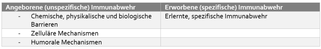 Man unterscheidet zwischen der Angeborenen (unspezifischen) Abwehr und der erworbenen Immunabwehr.