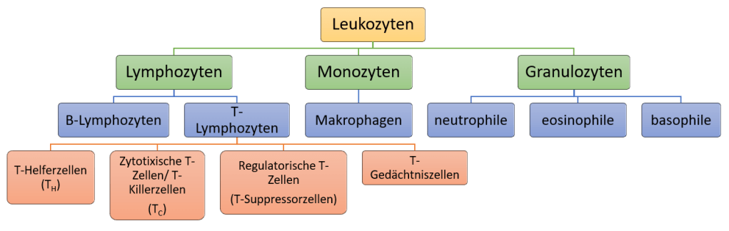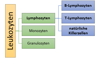 Die Leukozyten sind für die Infektionsabwehrzuständig. Damit übernehmen sie eine zentrale Rolle in der Immunabwehr. Es bestehen drei verschiedene Gattungen der Leukozyten: