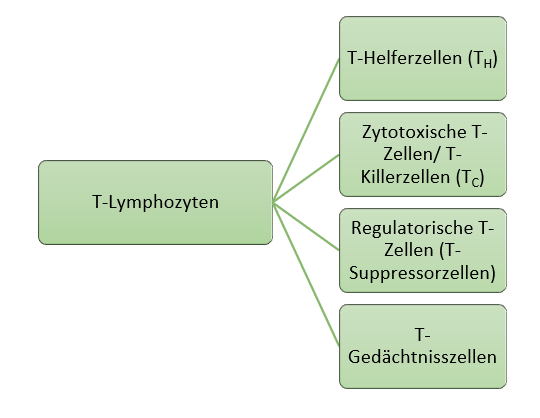 Schon während der Perinatalperiode und der Kindheit wachsen diese heran und verlassen, als der Träger der zellvermittelnden Abwehr in Lymphknoten, Milz und Darmschleimhaut, den Thymus. T-Lymphozyten werden in ihren funktionellen Aufgaben in vier Unterformen eingeteilt.