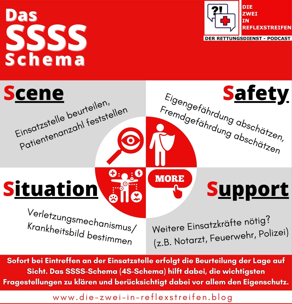 Das SSSS- Schema dient einer schnellen Lagebeurteilung bei Eintreffen an einer Einsatzstelle. Es hilft dabei, die wichtigsten Fragestellungen zu klären unter Berücksichtigung des Eigenschutz. Es soll zügig erkannt werden welche Gefahren, welche Anzahl an Patienten, welche Verletzungsmuster/Krankheitsbilder vorliegen und ob weitere Einsatzkräfte wie Feuerwehr (technische Hilfeleistung) Notarzt, LNA/OrgL oder Polizei benötigt werden.