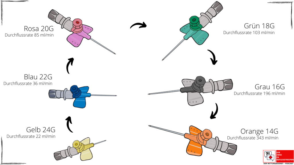 Wie mit allen Entscheidungen in der Medizin muss auch hier differenziert werden, welche Größe notwendig ist. Ein Patient, der an einer Hypoglykämie leidet benötigt in der Regel keinen orangen i.v. Zugang, während eine hypotone Patientin mit einem Oberschenkelhalsbruch von einem größeren Durchmesser profitiert. Auch Babys und Kinder müssen hier erwähnt werden.